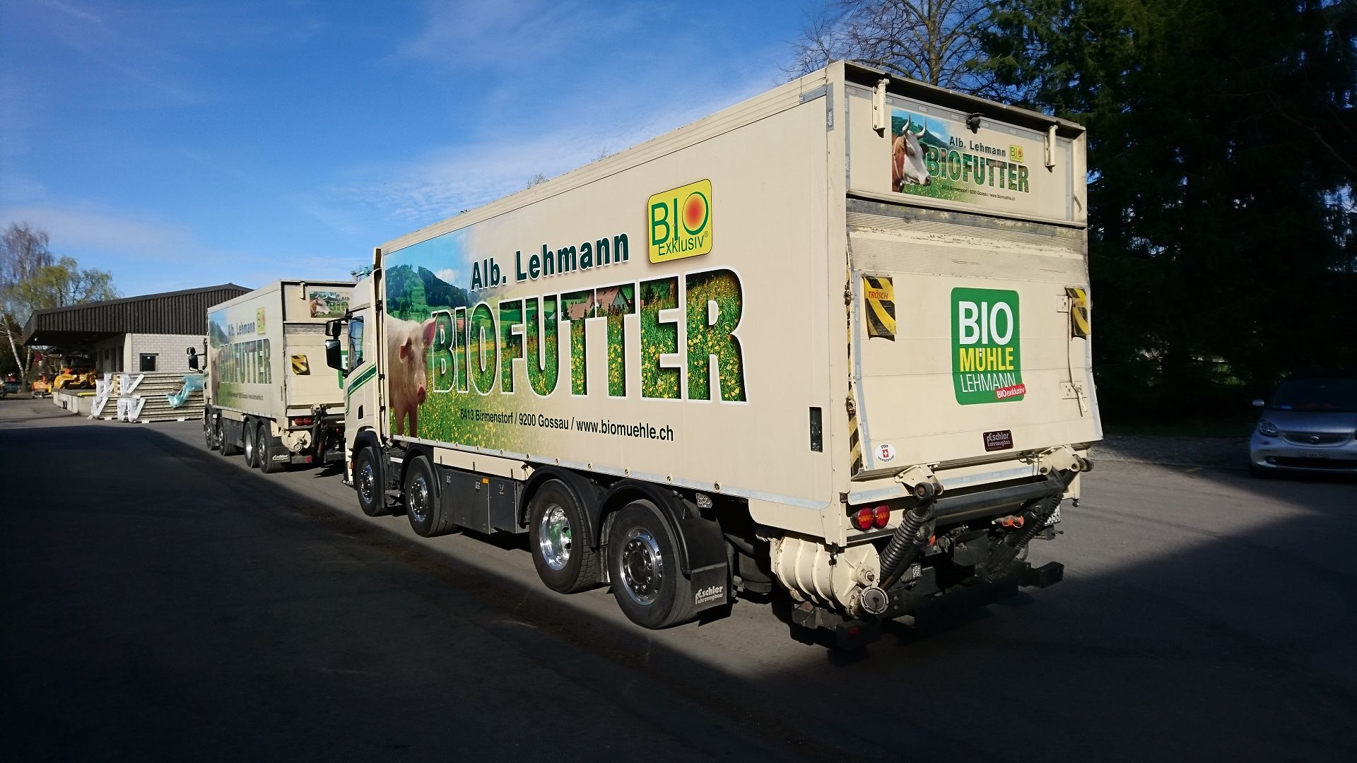 Wir produzieren nicht nur biologisch, wir vertreiben auch biologisch! Und zwar mit unserer eigenen LKW-Flotte: So können wir stets sicherstellen, dass mit den «Biomühle» beschrifteten Fahrzeugen auch nur Biofutter transportiert wird.